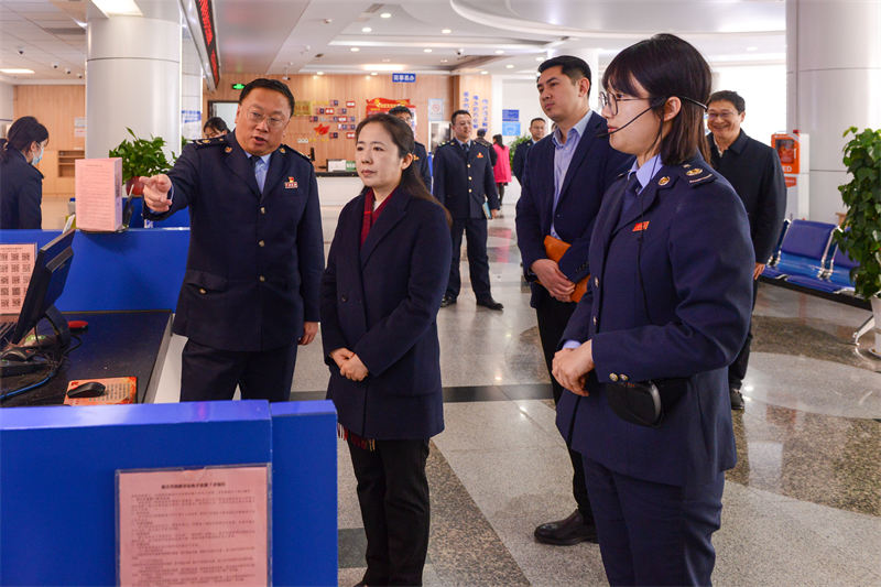 孙静同志一行实地调研了自助办税区、综合服务窗口和“上合融e办”服务平台等各功能区运行情况,详细了解了云端征纳互动服务工作,查看了办税服务厅文化建设、宣传阵地等工作开展情况,观摩了胶州局“胶税星火”党员活动中心和桂香创新工作室,听取了文明单位创建、税务文化建设、税收宣传及普法等工作开展情况的汇报。