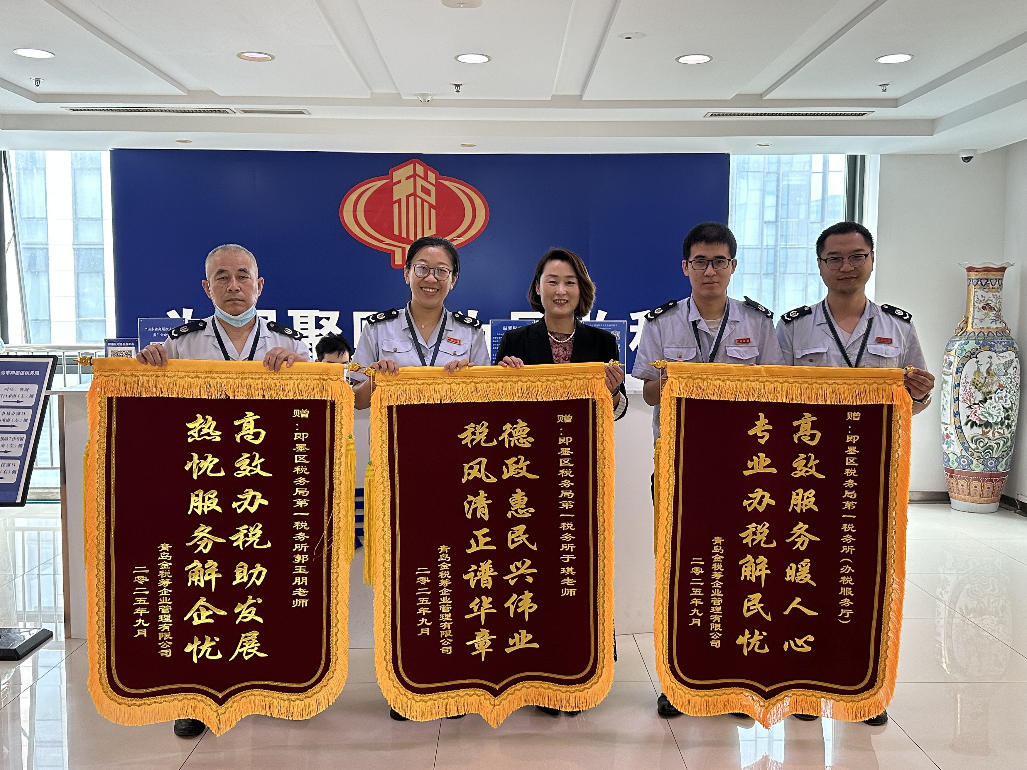 近日,即墨区税务局办税服务厅内暖意融融,青岛金税筹企业管理有限公司法定代表人邵女士一行专程送来三面锦旗。锦旗上“高效服务暖人心,专业办税解民忧”“德政惠民兴伟业,税风清正谱华章”“高效办税助发展,热忱服务解民忧”的烫金大字,表达了企业对即墨区税务局工作人员高效、热忱、用心服务的诚挚感谢与高度认可。