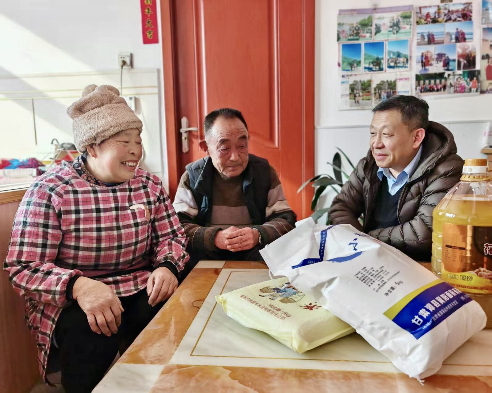 在困难老人家中,慰问组一行送上米面油等生活物资,并将带来的福字和春联张贴在门框上。干部围坐身旁,关切询问身体状况、日常起居和用药需求,叮嘱要注意保暖、安全用电。