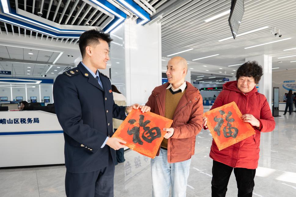为传承中华传统文化,营造喜庆祥和的节日氛围,崂山区税务局在办税服务大厅开展“送福纳税人”写“福”字迎新春活动,以笔墨传递温情,为纳税人送上真挚的新春祝福。