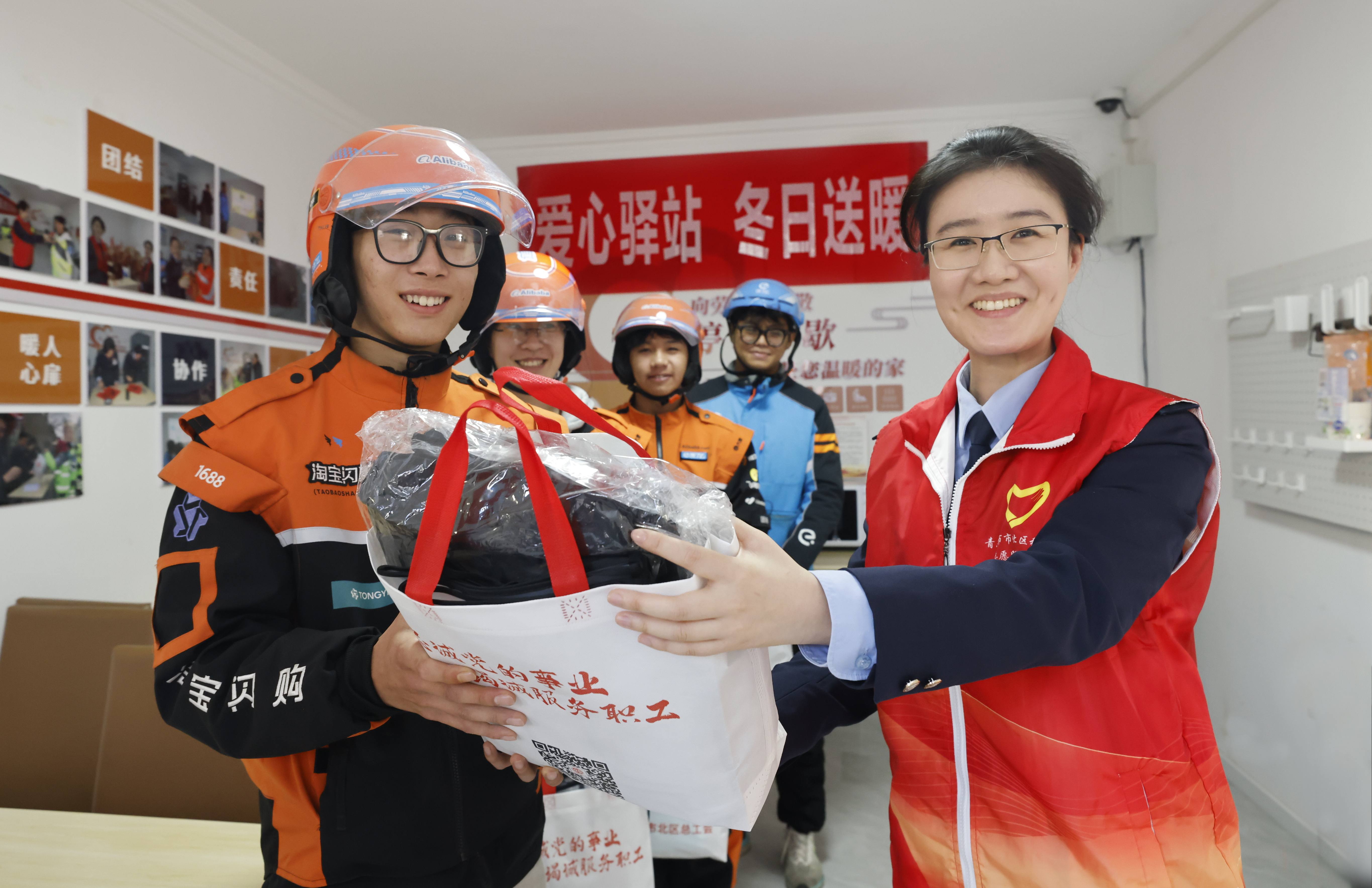 日前,市北区税务局的青年志愿者们走进山东路179号户外劳动者驿站,开展“冬日送温暖”活动,将定制的防寒物品送到前来休息的外卖骑手和环卫工人手里。