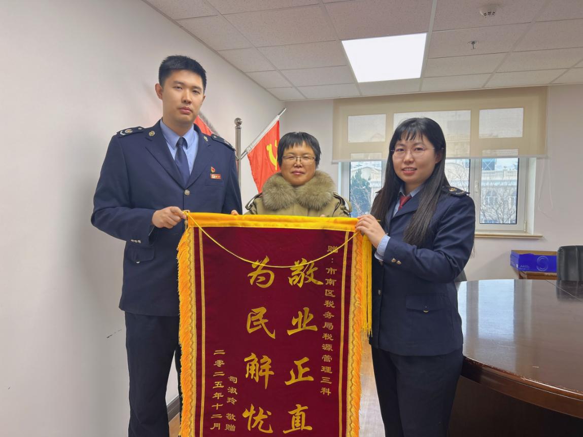 近日,市南区税务局高效处理一起社会保险费缴费基数争议,切实维护了参保职工的合法权益,获得群众赞誉。举报人司女士专程送来锦旗,对税务部门履职尽责、为民解忧的工作作风表示感谢。