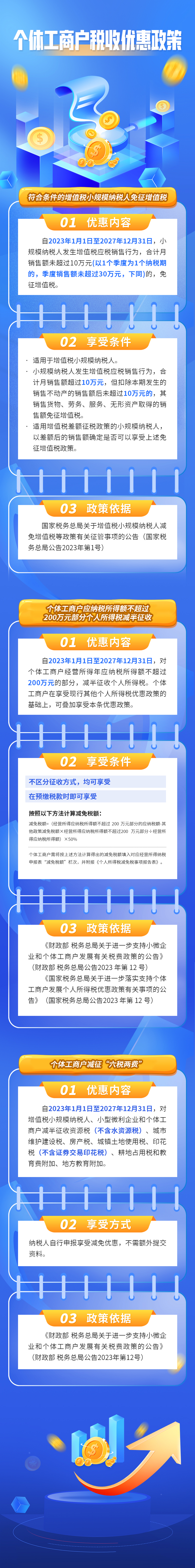 相关链接: 国家税务总局关于增值税小规模纳税人减免增值税等政策有关征管事项的公告 财政部 税务总局关于进一步支持小微企业和个体工商户发展有关税费政策的公告 国家税务总局关于进一步落实支持个体工商户发展个人所得税优惠政策有关事项的公告